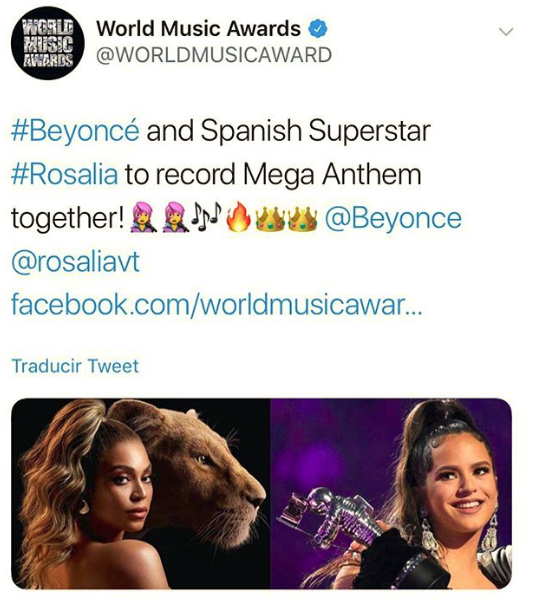 Es por eso que una publicación en días pasados que emitió Wolrd Music Awards en su cuenta de Twitter, encendió las alarmas de lo que podría ser un “mega himno” de nivel internacional entre Rosalía y Beyoncé.