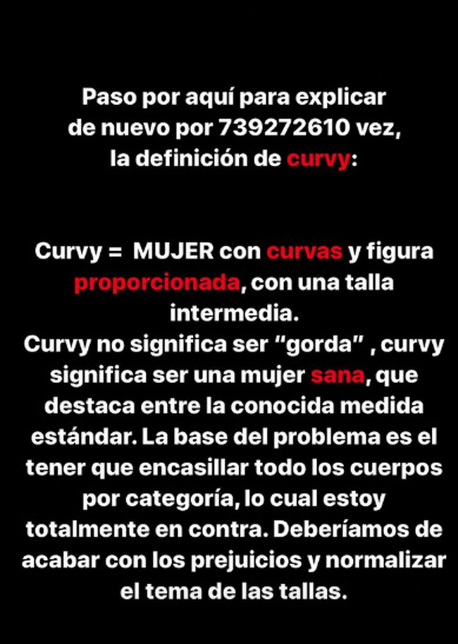 La modelo Lorena Durán ha compartido un stories en Instagram con una sencilla y clara explicación para aclarar el significado de chica ‘curvy’ y, de paso, dar por zanjada la polémica sobre su cuerpo.