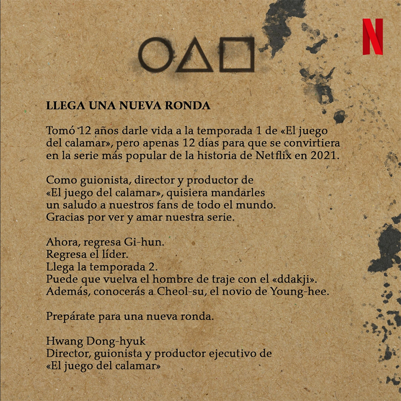 Hwang Dong-hyuk, creador de la serie, escribió en una carta ciertos detalles que seguramente emocionarán a los seguidores de la historia: “Ahora, regresa Gi-hun. Regresa el líder. Llega la temporada 2. Puede que vuelva el hombre de traje con el “ddakji”. Además, conocerás a Cheol-su, el novio de Young-hee”.